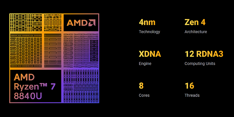 ה-AMD Ryzen 7 8840U הוא מעבד חזק עם 8 ליבות ו-16 threads שפועל במהירות של עד 5.1GHz עם ארכיטקטורת Zen 4.