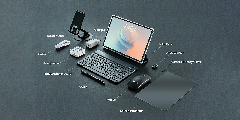 הטאבלט של Teclast מגיע עם ערכת "All-in-One" מקיפה, הכוללת מעמד טאבלט מתכוונן לצפייה נוחה ועט מגע מדויק ליצירה.