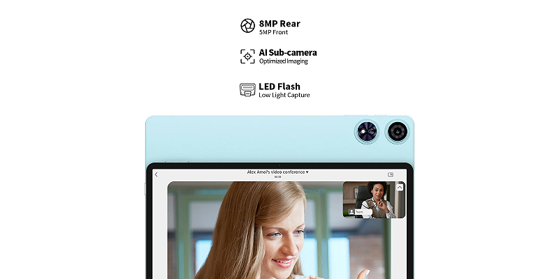 הטאבלט כולל מצלמה קדמית 5MP, מושלמת לפגישות ושיחות וידאו עם איכות ברורה ומקצועית.