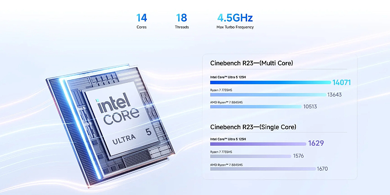 מצויד במעבד Intel Core Ultra מהדור החדש, Intel® Core™ Ultra 5 125H עם 14 ליבות ו־18 תהליכונים, ומהירות בוסט של עד 4.5GHz,