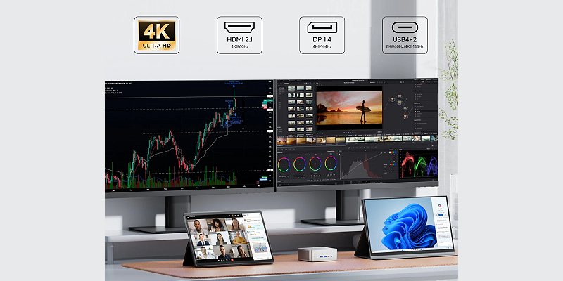 באמצעות USB4, HDMI 2.1 ו־DP 1.4, ניתן לחבר עד ארבעה מסכים ברזולוציית 4K בו זמנית,