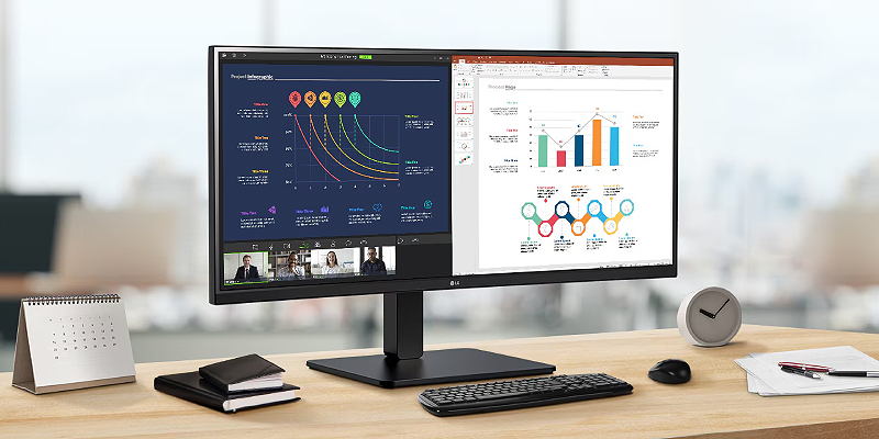צג LG ברזולוציית WQHD (3440x1440) עם טכנולוגיית IPS מספק צבעים ברורים ועקביים.