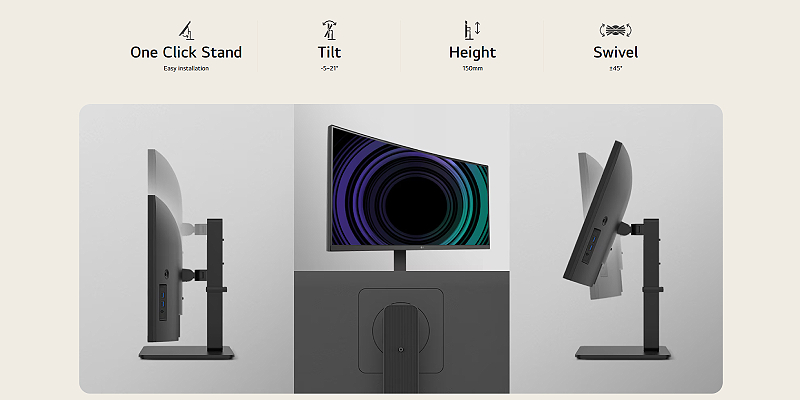 כיוונון גובה והטייה בלחיצה אחת מאפשרים התאמה מושלמת של המסך לזווית הצפייה הרצויה.