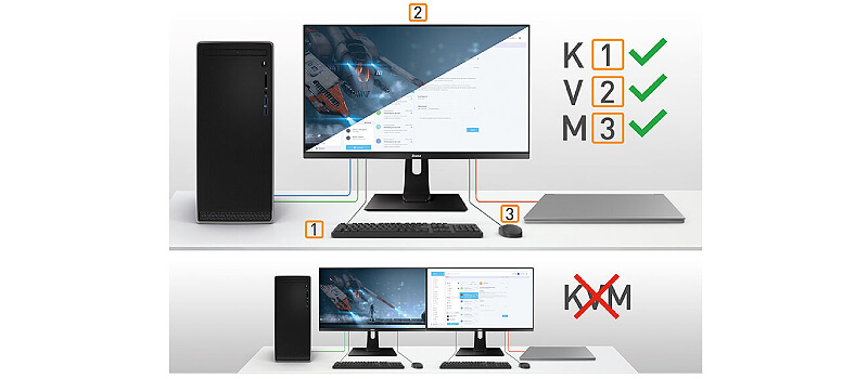 צג עם מתג KVM מאפשר לך לשתף את ההתקנים המחוברים באמצעות USB לצג שלך עם שני מחשבים שונים.