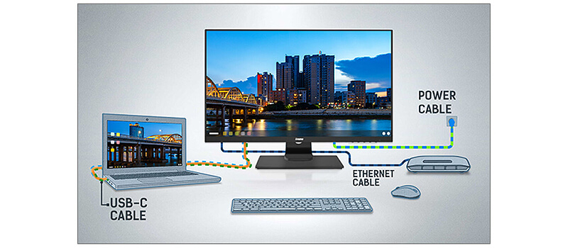 מאפשר לך לחבר את המחשב הנייד שלך עם כבל בודד למסך כדי לוודא שהוא טעון ומחובר לרשת קווית, והאות מהמחשב הנייד נשלח לצג.