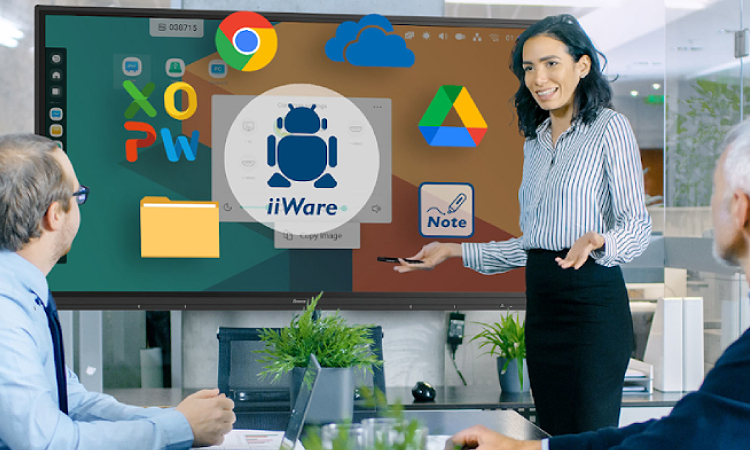 מסך מגע בגודל 75 אינץ' עם 20 נקודות מגע ומגיע עם iiWare (Android 9.0 OS) כולל Note, דפדפן אינטרנט, מנהל קבצים, כונני ענן, WPS office ו- ScreenSharePro.