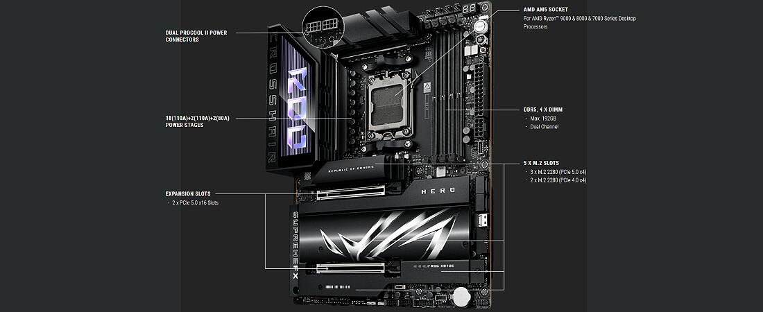 ה-ROG Crosshair X870E Hero מוכן למחשוב AI ומציע אספקת כוח בלתי מתפשרת, ניהול תרמי חזק, קישוריות מהירות גבוהה, תמיכה מקיפה ב-PCIE 5.0