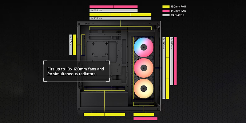 התאם אישית את מערך הקירור שלך עם מקום לעד 10 מאווררי 120 מ״מ, בתוספת אפשרויות מגוונות להתקנת רדיאטורים – כולל עד 360 מ״מ בצד ובגג.