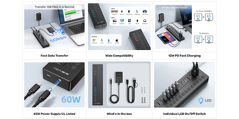 עם מהירויות העברת נתונים של 5Gbps ו-16 חיבורי USB למגוון כבלים,