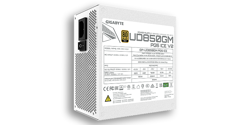 ספק כוח UD850GM PG5 ICE V2 מבית Gigabyte, בצבע לבן, בהספק של 850W, תאימות ATX 3.1, יעילות אנרגטית 80+ Gold ומודולארי מלא. GP-UD850GM-PG5-ICE